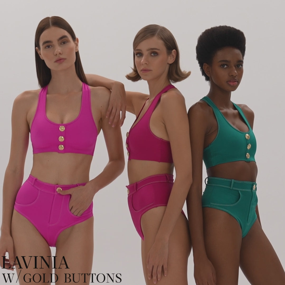 Lavinia mayo kemer britleri, gold düğmeleri ve yüksek belli jeanlarin görünümünü yansıtan stratejik konumlu cepleriyle yaratıcı bir tasarıma imza atıyor. Yüzücü stil tasarımı da sportif bir dokunuş katıyor. Mükemmel bir yaz görünümü için güneş gözlükleri, favori şapkanız ve harika gülümsemenizle tamamlayın.