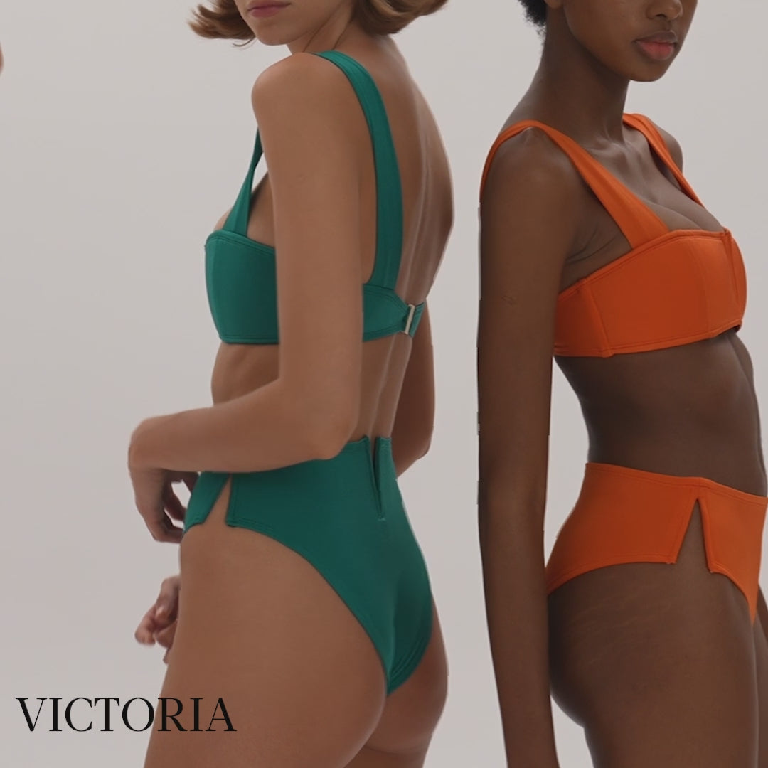 Nefes kesen Victoria bikini kalıbınızı çalacak. Düz göğüs kesimi, zarif dekolte detayı ve V şekilli yırtmaçlı altıyla hem sportif hem iddialı bir bikini sunuyoruz. Yüksek belli alt (burada görülen) arkadaki V şekilli detayıyla sofistike bir siluet yaratıyor. Bikini üstünü crop üst olarak favori şortunuz ve oversize bir ceketle giyebilirsiniz.